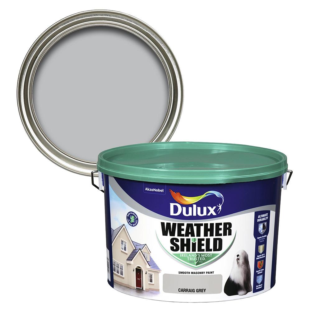 Dulux Weathershield Smooth Exterior Masonry paint is Made in Ireland to protect Irish homes from our unique weather. The Ultimate Durability formula with Superior Flexibility protects the paint from cracking and flaking, while Superior Colour Retention ensures colours stay true and Superior Mould Resistance works against mould and algae growth for longer thanks to slow-release encapsulated biocide technology. Dulux Weathershield Ultimate Durability is our most durable exterior paint ever. - Fast Shower Resistance - Protection against Cracking & Flaking - Superior Colour Retention Application Method: - Brush or Roller Base: - Water Cleaning: - Garden Brush or Hose Coverage: - 16m? per litre Disposal: - Check Local Recycling Centre Drying Time: - 2-4 hours These times will be significantly longer in cold, damp conditions Drying Time Recoating: - 2-4 hours These times will be significantly longer in cold, damp conditions Durability: - High Fade Resistant: - Yes Finishing Type: - Matt Manufacturing Warranty: - We promise our paint will give you the perfect colour with a uniform finish and the coverage stated, or we'll replace it. T&C's apply: dulux.ie/promise Number of Coats Required: - 2 Product Type: - Masonry Stain Resistant: - Yes Storage: - Keep in a dry/cool place standing upright Suitable Surface: - Masonry
