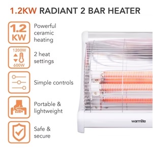The Warmlite Radiant 2 Bar Heater - 1200W is both portable and energy efficient and brings an element of warmth to any room, ideal for use during cold spells. The 1200W output make this heater ideal for use in offices, workshops and garages, fitted with an integrated carry handle for easy portability and convenient placement in any room you desire. The anti-tip over safety feature helps to ensure stability, while the indicator light shows when the heater is in use, making it both reliable and safe during use.